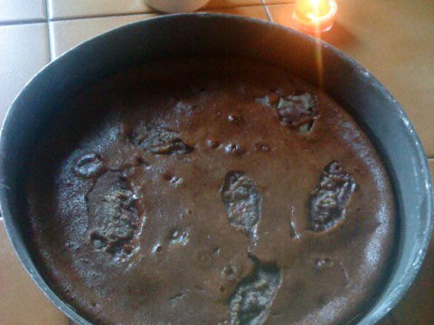 Faire fondre le chocolat dans le lait en mélangeant.Fouetter les oeufs avec le sucre et la farine et ajouter le lait chocolaté. Verser la pâte dans un moule antiadhésif ou en silicone.
