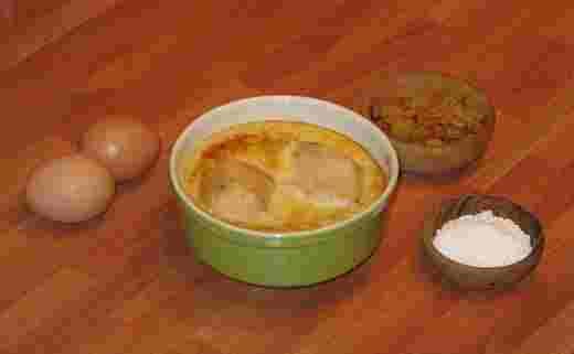 Répartissez l'appareil dans les 2 ramequins. Saupoudrez de raisins. Déposez 2 moitiés poires face bombée sur le dessus dans chaque ramequin.