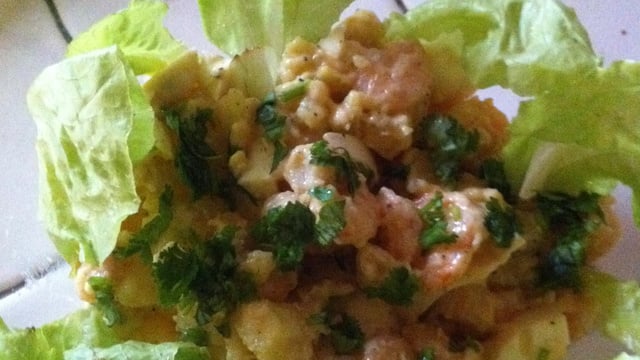 Dans un saladier, mélanger la mayonnaise, un peu de ketchup du sel et du poivre. Ajouter les crevettes et la pomme de terre coupée en dés (de la taille des crevettes).