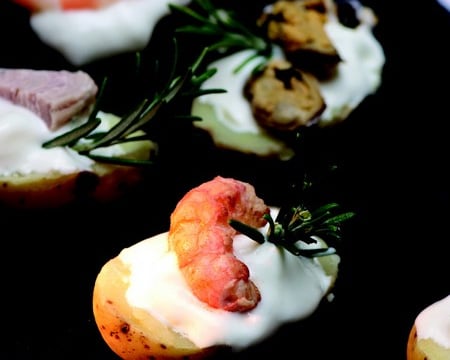 Garnir la moitié des pommes de terre avec l'appareil aux algues et rajouter crevette, moule, thon fumé, saumon et langoustine.