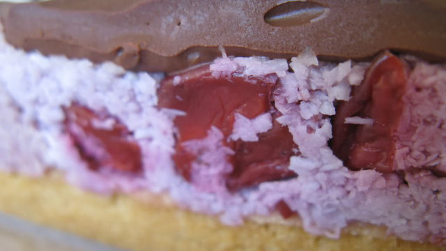 Un petit gâteau avec de la noix de coco, du chocolat et des cerises.