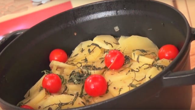 Ajoutez une branche de thym, salez et couvrez la cocotte. Coupez les pommes de terre en lamelles épaisses et déposez sur la viande. Salez, ajoutez les branches de thym et un peu de poivre. Couvrez puis faites cuire à feu doux pendant 60 minutes soit au four à 150°C pendant 45 à 50 minutes. Au 3/4 de la cuisson, ajoutez les tomates coupées en deux et un peu de menthe. Prolongez la cuisson et servez.