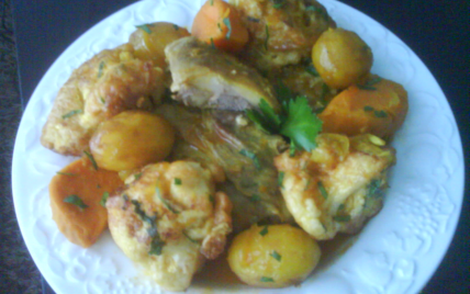 Ajoutez les pommes de terre dorées et les morceaux de patate douce dans la cocotte, poursuivre la cuisson une dizaine de min jusqu'à ce qu'elles soit tendre, ajoutez le choux fleur et éteindre la cocotte.