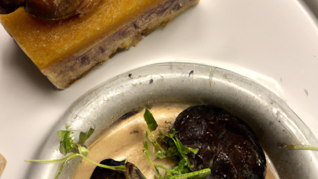 Foie Gras de Canard entier cuit sur un lit de pommes de terre et truffes noires du Périgord en rosace.
