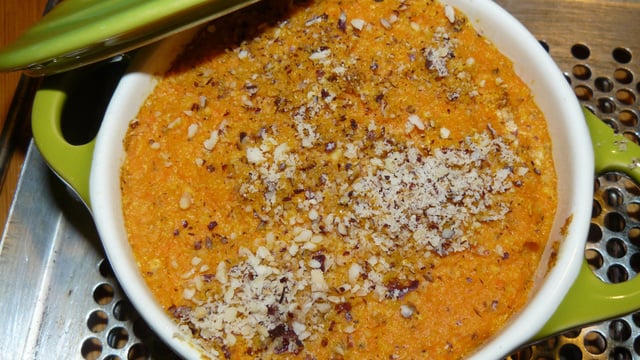 Ajouter cette préparation à la purée, ainsi que les 3/4 des noisettes, la muscade sel et poivre.