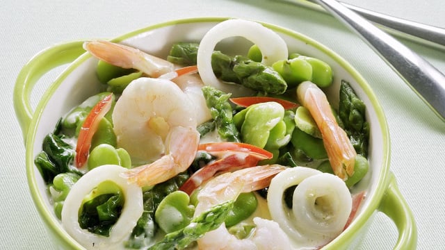 En fin de cuisson ajouter les légumes verts et assaisonner. Dans une casserole faire réduire le vin blanc de moitié avec les échalotes hachées.