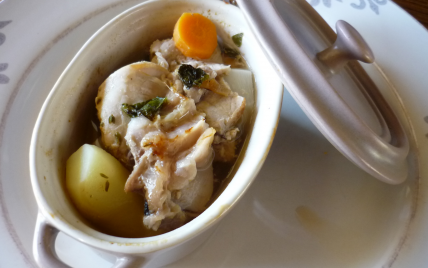 Dans des mini cocottes, déposez les légumes, le lapin, de la sauce au vin blanc et quelques herbes aromatiques (thym et persil). - 3