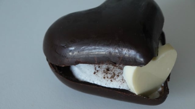 Prendre votre coeur chocolat avec la mousse dedans. Déposez un peu de chantilly. Ajoutez des petits copeaux de chocolat. Déposer la deuxième coque de coeur en chocolat pour fermer. Vous pouvez selon votre envie déco, déposer un coeur chocolat blanc dessus.