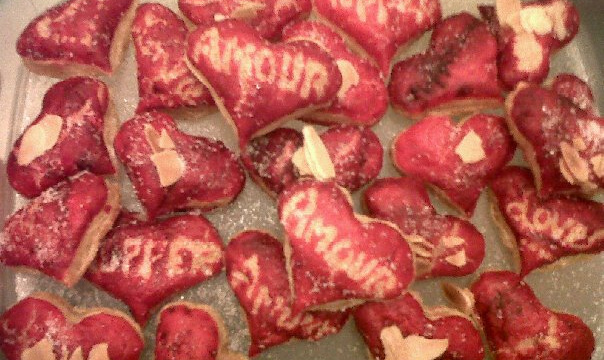 Étaler votre pâte feuilleteé sur la plaque a cœur. Disposer les cœurs sur le papier sulfurisé ou sur la feuille de cuisson tupperware. Étaler avec le pinceau silicone tupperware ou avec le doigt le colorant alimentaire ou les inscriptions faire écrire avec un couteau le mot que vous désirer puis passer délicatement le colorant pour ne pas qu'il pénètre dans l inscription.