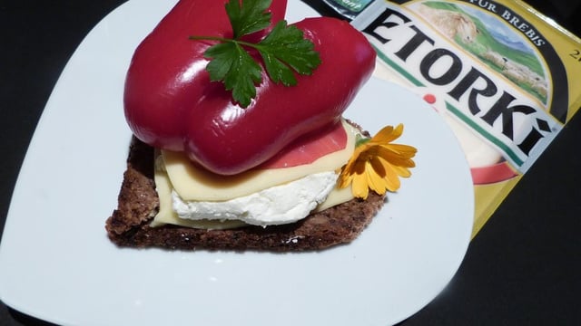 Sur une belle assiette, disposez une tranche de pain noir découpée en forme de coeur, tartinez- la de carré frais au poivron et au piment d 'Espelette, recouvrez avec une tranche d'Etorki puis une autre de magret fumé. Tartinez à nouveau de carré frais aux poivrons puis disposez une autre tranche d'Etorki. Terminez avec un joli coeur de poivron rouge, selon votre inspiration et votre gourmandise. Servez bien frais, il est grand temps de vous régaler !