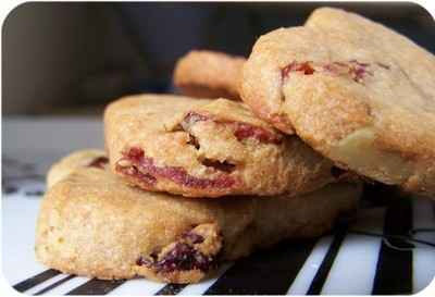 "Pour cette recette, j'ai utilisé la recette des shortbreads de Pascale, déjà testée et approuvée avec les sablés au citron et au pavot. J'ai simplement remplacé 1/3 de la farine par de la farine de chataîgne et ajouté quelques fruits secs qui erraient sans but dans le placard. Le résultat, c'est un sablé croquant-fondant et une douce saveur sucrée si particulière de la farine de chataîgne. Le petit plus, c'est aussi l'acidité des cranberries séchées qui contraste agréablement avec toute cette douceur..."