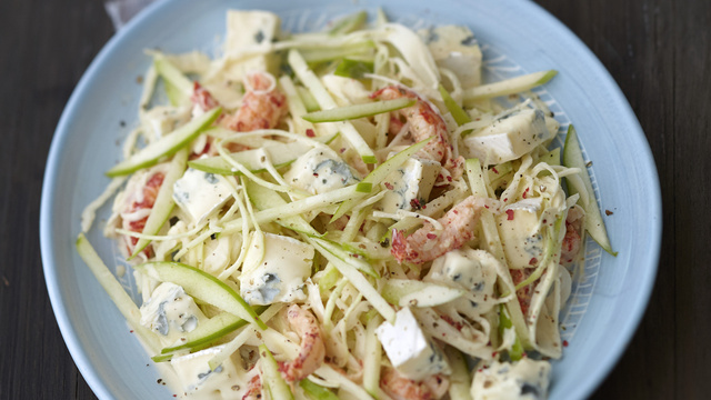 Ajoutez le chou blanc émincé, les bâtonnets de pomme verte, les écrevisses et le Bresse Bleu Le Véritable coupé en petits cubes.