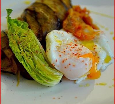 Pochez les œufs dans une eau bouillante vinaigrée sans sel. Etalez les tranches d'aubergine à plat pour faire 2 rectangles d'aubergine. Ajoutez la piperade refroidie au milieu des aubergines et roulez-les aussitôt. Dressez l'assiette harmonieusement en ajoutant l'œuf poché et la sucrine que vous assaisonnerez.