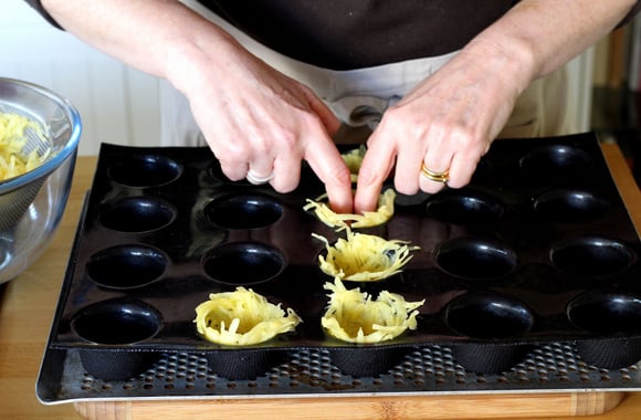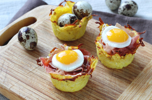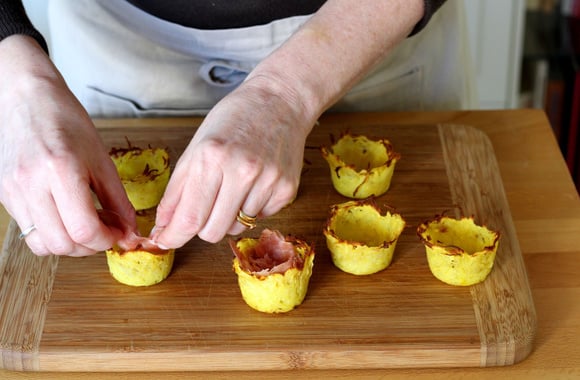 Laissez refroidir 5 minutes puis démoulez sur une grille, en vous aidant d'une petite cuillère. Tapissez les nids avec des lanières de jambon.