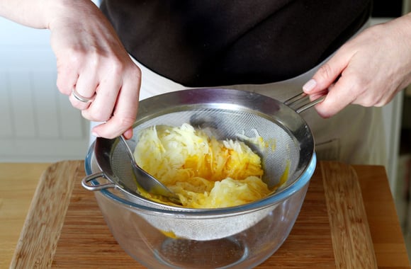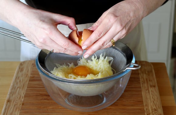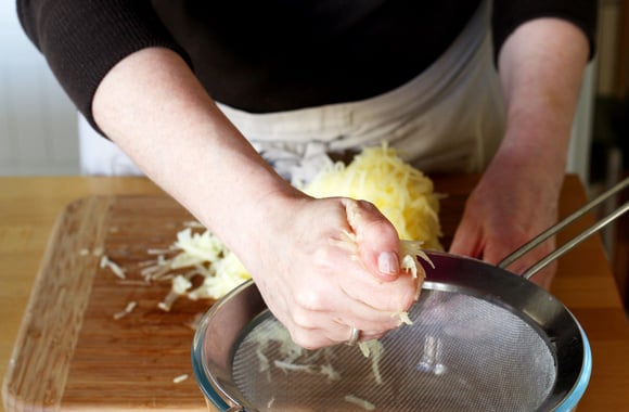 Pressez les pommes de terre râpées entre vos mains, afin de retirer le maximum de liquide.