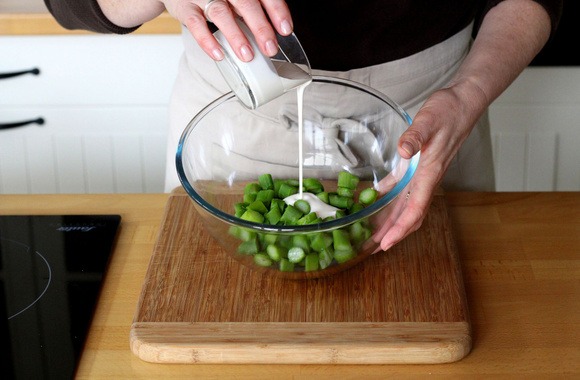 Egouttez les tronçons d'asperges et versez-les dans un bol. Ajoutez la crème.