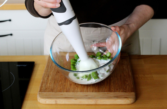 Mixez les tronçons avec la crème. L'idéal est d'utiliser un mixeur plongeant plus rapide à nettoyer qu'un robot mixeur.