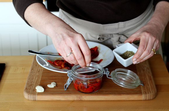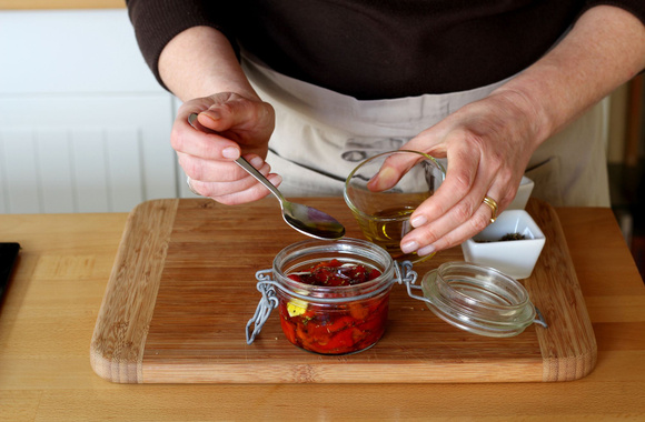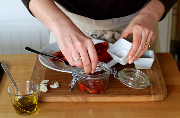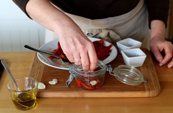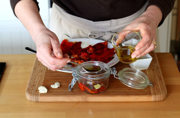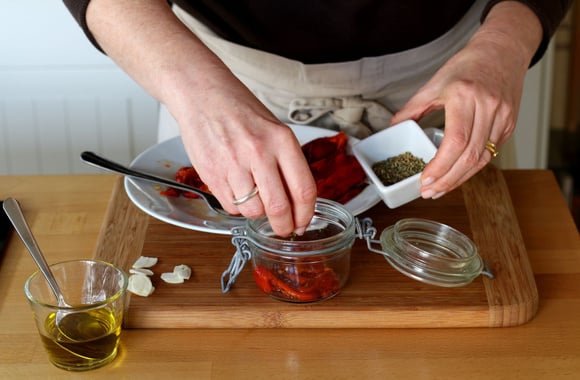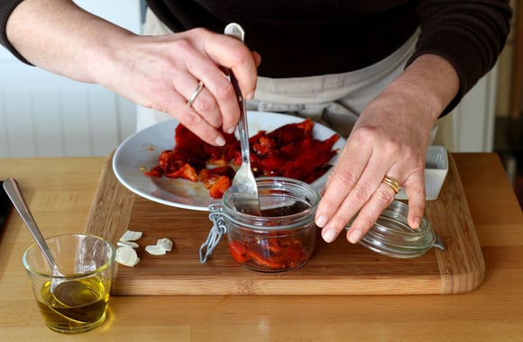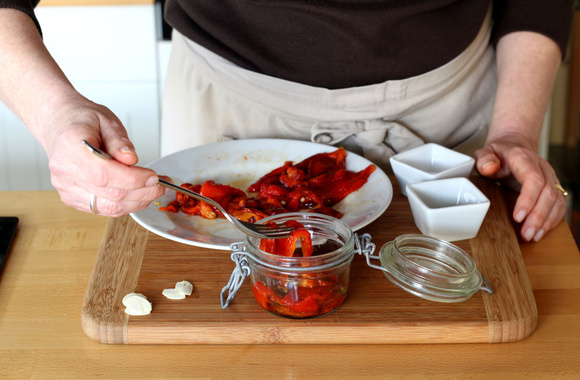 7Déposez une couche de poivrons dans le fond du bocal.