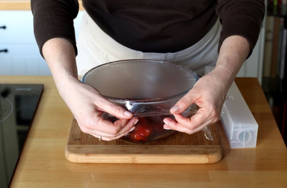 4Recouvrez le bol d'un film étirable. Cette opération permet de retirer encore plus facilement la peau. Laissez tiédir pendant 15 minutes, juste pour ne pas vous brûler les doigts quand vous allez retirer la peau des poivrons.