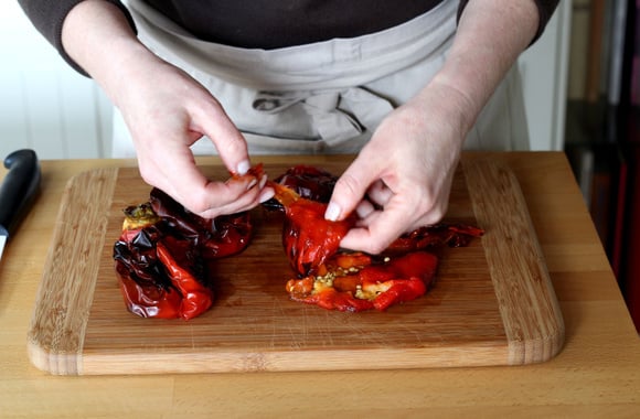 5Posez les poivrons sur une planche et retirez la peau avec vos doigts. Coupez la chair en morceaux, tout en retirant les graines.