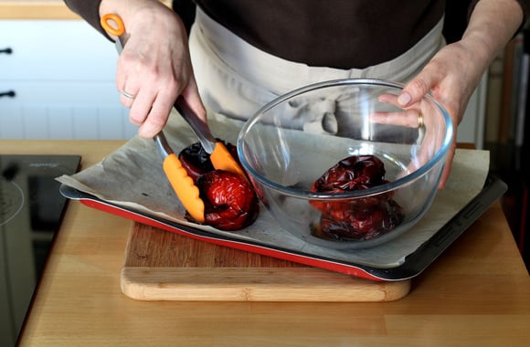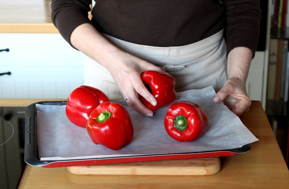 2Posez vos poivrons sur une plaque de cuisson recouverte de papier cuisson. Enfournez pour 30 à 40 minutes. Tournez les poivrons à mi-cuisson. Ils sont prêts lorsque la peau est un peu noire.