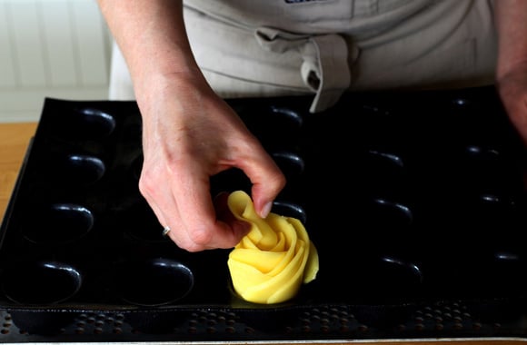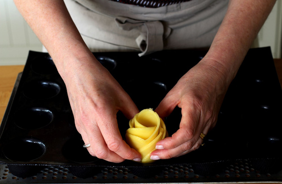 Ces pommes de terre en forme de roses accompagnent à la perfection nos roulades de dinde au jambon et tomates séchées, sauce au Morbier.