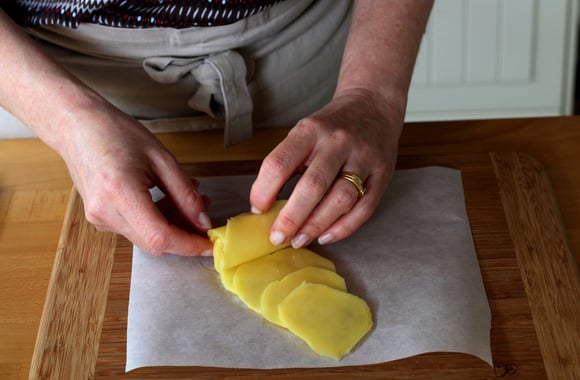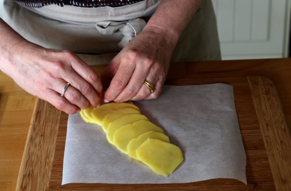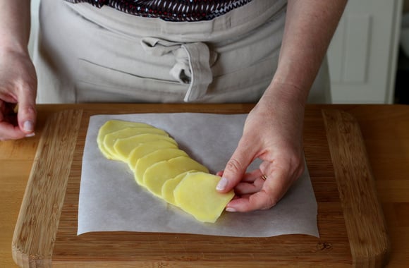 Sur une feuille de papier cuisson, faites se chevaucher 10 à 15 tranches de pommes de terre.