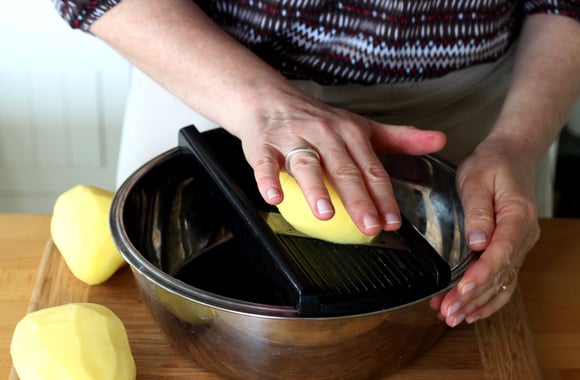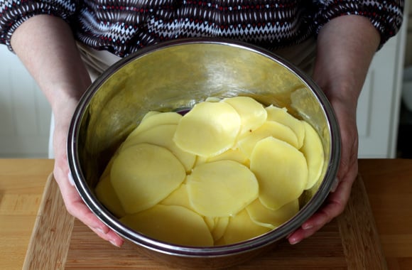 Coupez-les en tranches très fines en vous servant si possible d'une mandoline. Ne rincez pas vos pommes de terre, on a besoin d'amidon pour cette recette.