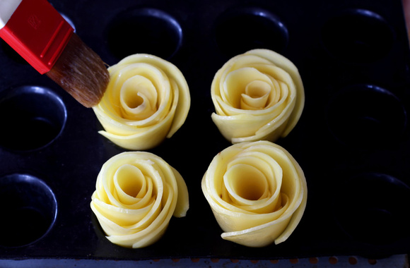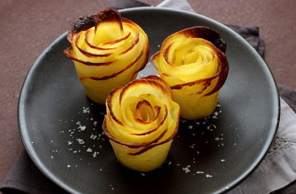 On adore ces pommes de terre en forme de rose ! Elles sont fondantes et super jolies, grâce à leur forme florale qui épatera vos convives ! Pour les réussir, il suffit de choisir des pommes de terre à purée qui, grâce à leur amidon, vont faire coller les pétales de pommes de terre les uns aux autres, vous donnant des roses de pommes de terre très moelleuses à la dégustation. C’est une idée originale et facile à préparer, idéale pour un repas raffiné, pour le buffet d'un apéritif dînatoire et pour les repas de Noël et de fin d'année. Ces pommes de terre en forme de rose accompagnent à merveille de la volaille rôtie ou en sauce, ou encore du poisson. Vous pouvez les préparer à l'avance et les réchauffer juste avant de passer à table.
