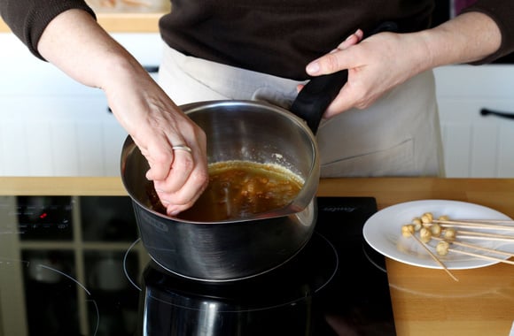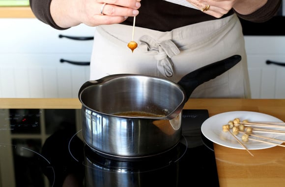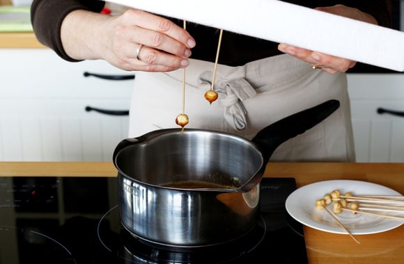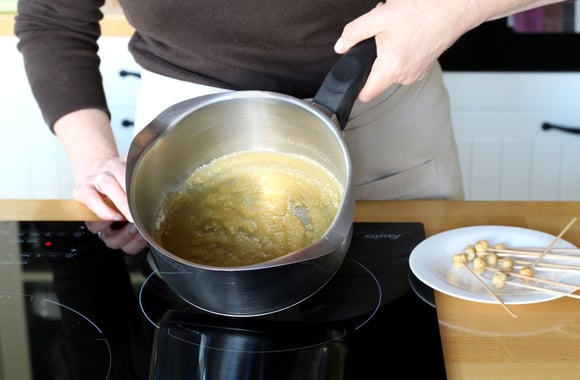 Surveillez la couleur. Dès que le caramel est bien ambré, mettez le feu au minimum puis trempez vos noisettes une par une afin de les recouvrir aux ¾.