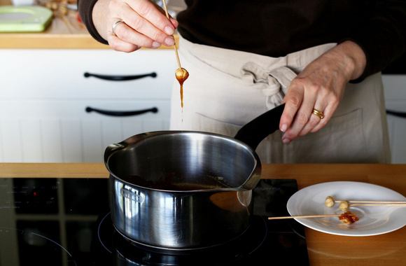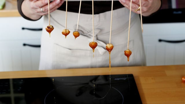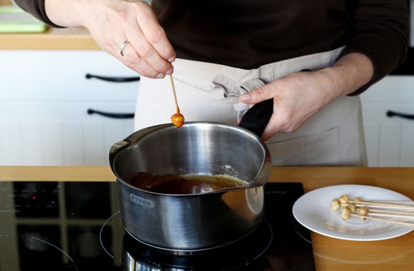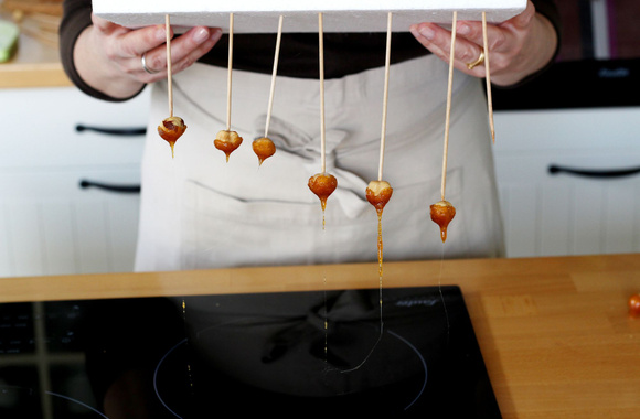 Piquez-les immédiatement sur une plaque en polystyrène, noisette en bas, afin que le caramel puisse former une pointe.