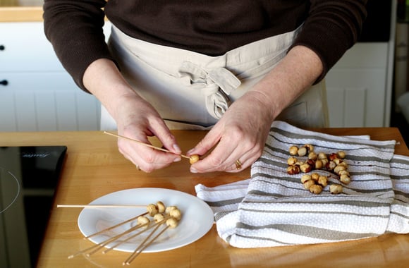 Piquez chaque noisette sur un pique en bois. Prévoyez un peu plus de noisettes si vous en cassez pendant cette opération.