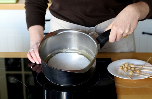 Le sucre va fondre petit à petit puis se transformer en un sirop épais. L'idéal est d'utiliser une casserole en inox pour bien voir la couleur du sirop et égallement parce que l'inox conduit la chaleur de manière uniforme.