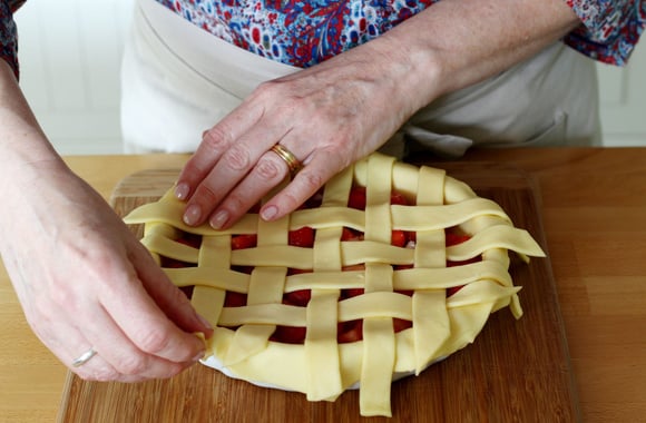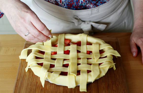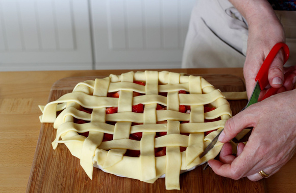 19Coupez les bords avec une paire de ciseau puis pressez avec vos doigts afin de bien sceller les bandes avec le dessous de la tarte.