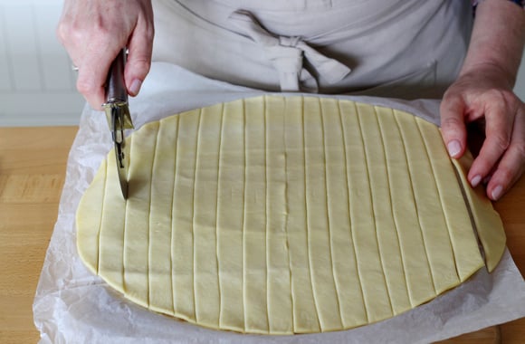 1Détaillez une des pâtes en 10 bandes d'1 cm et demi de large et mettez au frais.