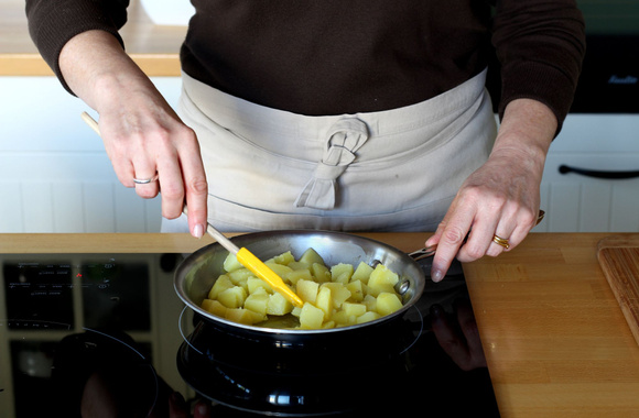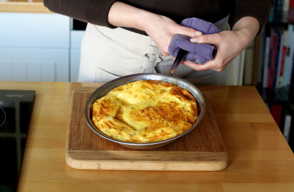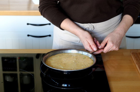 En Espagne, la cuisson se fait complètement à la poêle en retournant la tortilla à mi-cuisson. Dans cette version, nous avons terminé la cuisson au four. Veuillez à utiliser une poêle complétement en métal ou une poêle dont les poignées sont amovibles. Sinon, faites la même recette, dans un moule en métal beurré de 20 à 22 cm de diamètre ou dans un moule en silicone.