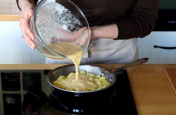 7Versez le mélange aux oeufs sur les pommes de terre, sans mélanger. On ne fait pas des oeufs brouillés ...
