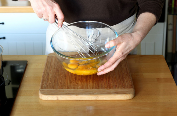 4Dans un bol, cassez les oeufs puis mélangez-les légèrement au fouet. Ajoutez la crème et mélangez. Pas de crème dans la version espagnole mais cela donne encore plus de moelleux à l'ensemble.