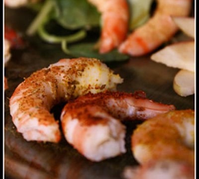 Ensuite, éplucher les gambas, et recouvrir d'épices (une épice, aromate ou miel, pour 2 gambas, selon votre goût).