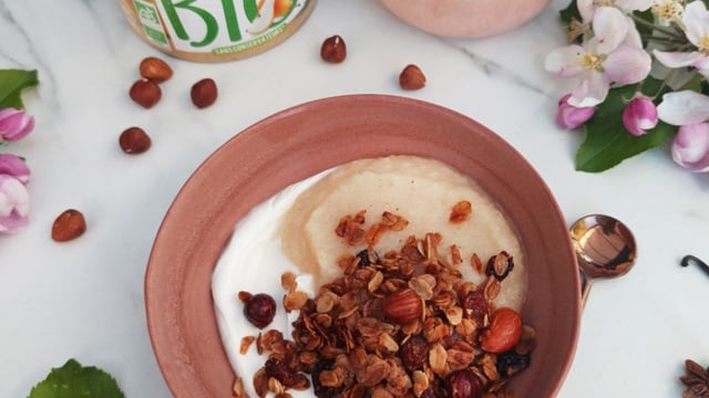 Servir votre compote de poire St MAMET dans un bol et saupoudrez la de votre granola maison.