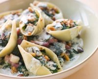 Mélangez des lardons de pancetta dans les épinards avec de petits dés de gorgonzola et les pignons de pin. Farcissez les pâtes avec ce mélange. Parsemez de parmesan râpé et passez le tout sous le grill du four. Servez aussitôt accompagné du reste de préparation aux épinards.