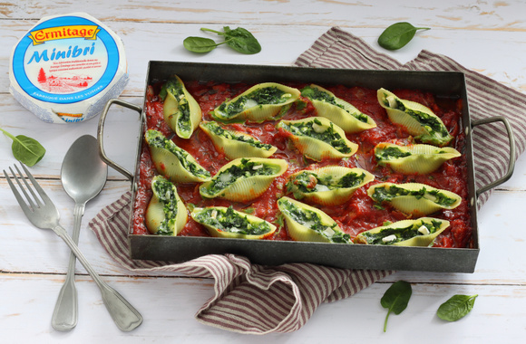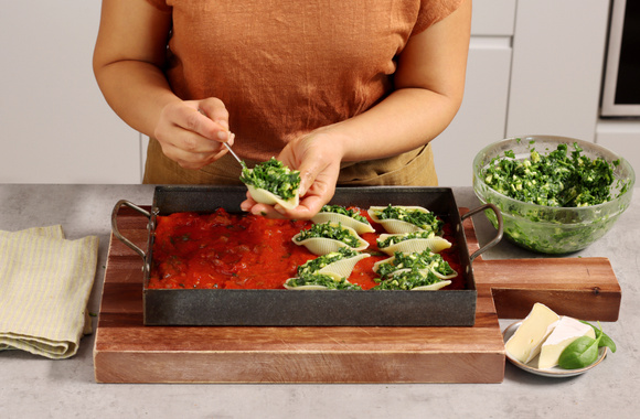 9Garnissez les conchiglioni avec la farce et déposez-les sur la sauce.