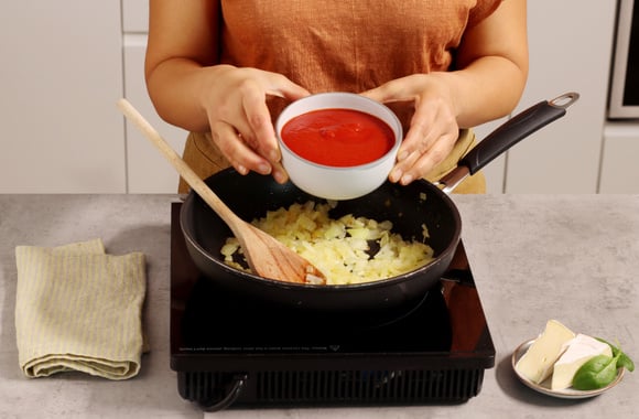 2Ajoutez la pulpe de tomates, salez, poivrez et laissez cuire à feu doux 10 minutes.