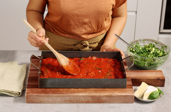 8Rafraîchissez les conchiglioni sous un filet d’eau froide puis égouttez. Mettez la sauce dans un plat allant au four.