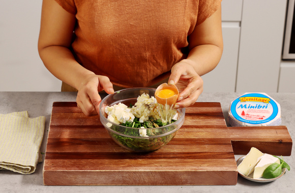 6Mettez les épinards hachés dans un saladier, ajoutez les morceaux de Minibri et l’œuf.