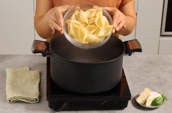 3Portez un grand volume d'eau salée à ébullition et faites-y cuire les conchiglioni 5 minutes de moins qu'indiqué sur le paquet.