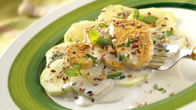 Verser cette sauce sur le concombre et les Tofinelle. Décorer de feuilles de menthe. Recouvrir le plat d'un film alimentaire ou d'une feuille de papier sulfurisé, et laisser reposer au frigidaire. Se déguste frais, pas froid.