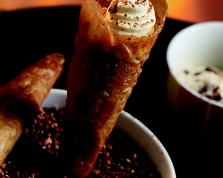 Tailler les feuilles de brick en quatre, les beurrer, puis sucrer. Réaliser des cônes, les cuire 5 min.