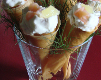 Farcir les cônes froids de cette crème fouettée et de lamelles de saumon fumé au dernier moment.