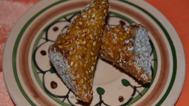 Une recette qui m'a été transmise par ma grand mère Tunisienne comme bien d'autres recettes orientales. Ces gâteaux sont aux saveurs de l'orient, des amandes moulues, de l'eau de fleur d'oranger, des graines de sésames dorés, des épices "la cannelle". Il faut des doigts de fée pour les réaliser. Ces cônes sont des gâteaux fins et gourmands que tout le monde appréciera autour d'un verre de thé aux pignons de pin.